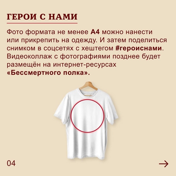 Нанести или прикрепить на одежду фотографию героя семьи и поделиться фото в соцсетях с хештегом #героиснами. Видеоколлаж с этими снимками позднее будет размещен на интернет-ресурсах Бессмертного полка.