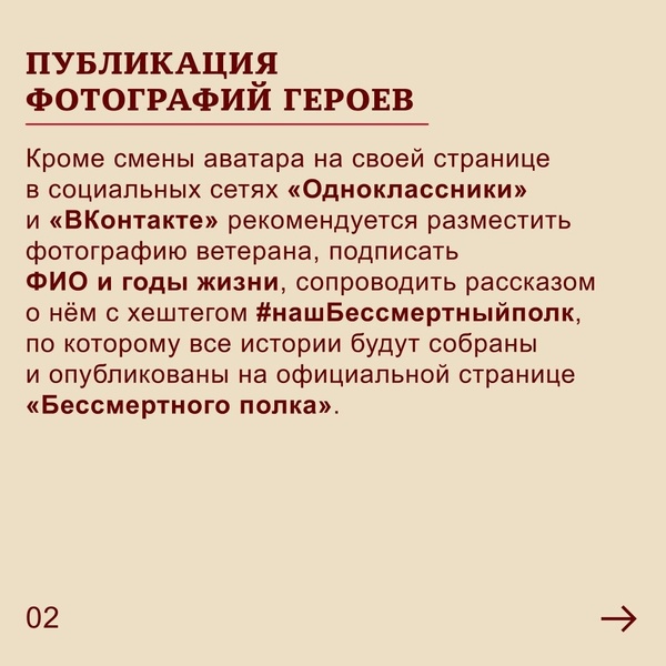 Разместить фотографию героя в своих аккаунтах в соцсетях, подписать имя и годы жизни, сопроводить рассказом о боевом пути с хештегом #нашБессмертныйполк;